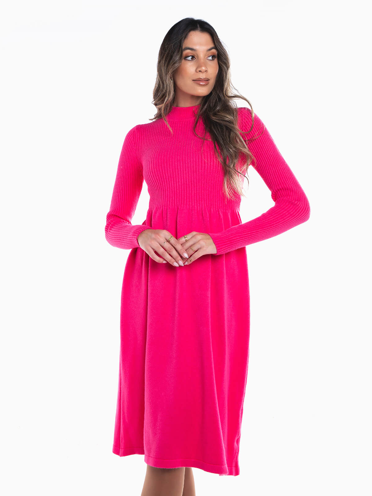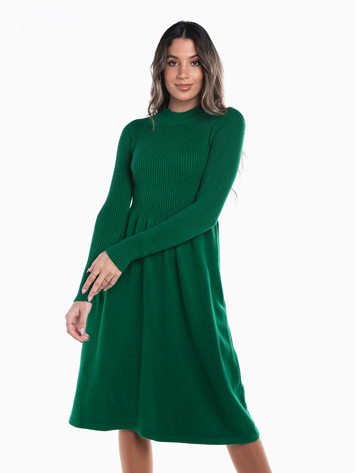Vestido midi em malha com mistura de viscose para maior conforto. Vestido evasé manga comprida com estrutura canelada na parte superior. Gola perkins.