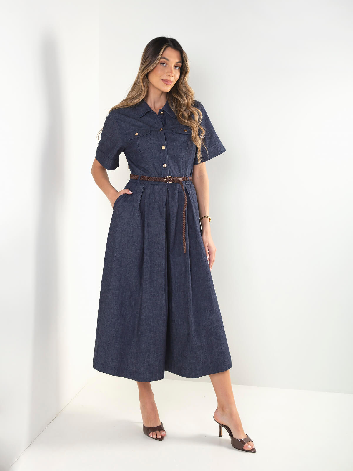 Vestido midi em tencel 100% algodão. Modelo com manga curta, colarinho e botões frontais, complementado por bolsos no peito e cinto entrançado que define a silhueta. Saia com volume e movimento, ideal para um look feminino, atual e fácil de usar no dia a dia ou em ocasiões mais cuidadas.