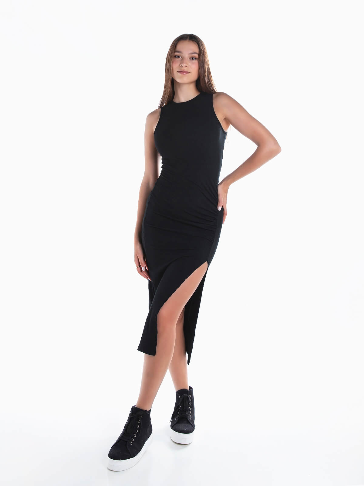Vestido midi preto com abertura e detalhes franzidos. Vestido justo sem mangas em malha canelada com decote halter.