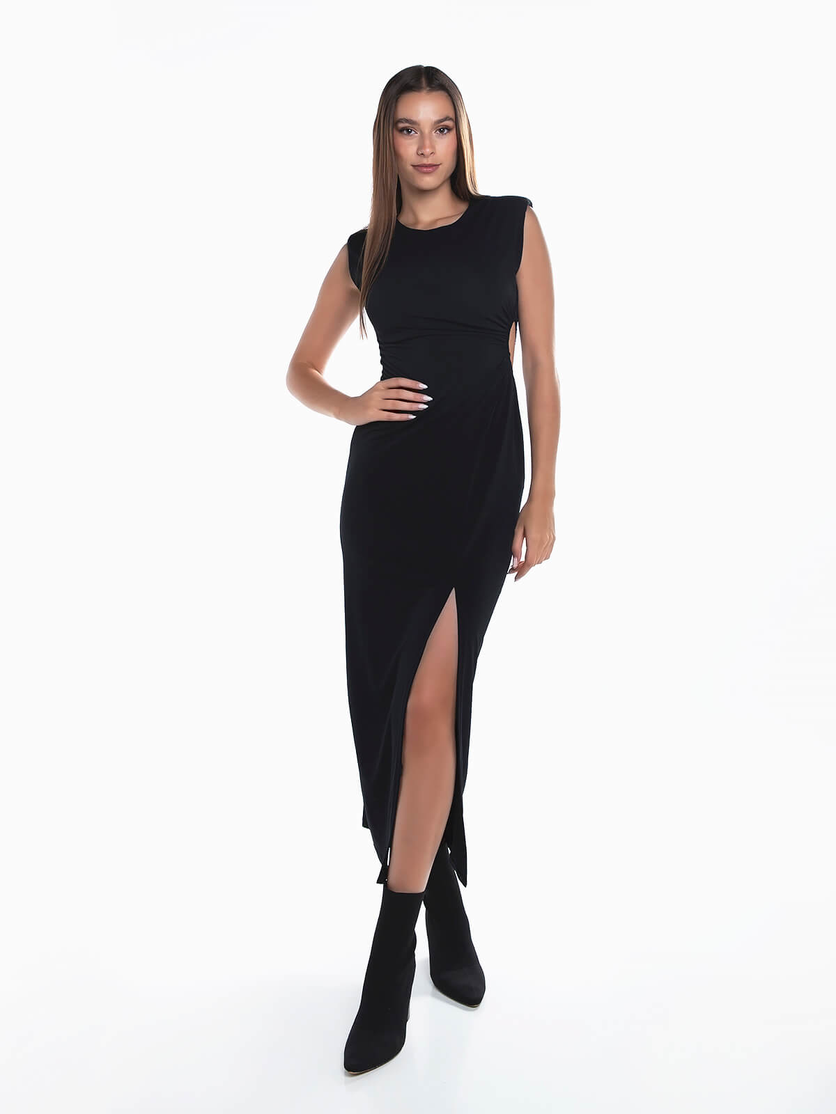 Vestido midi preto com detalhes recortados para senhora. Vestido manga cava com ombreiras aplicadas. Decote redondo e abertura na base.