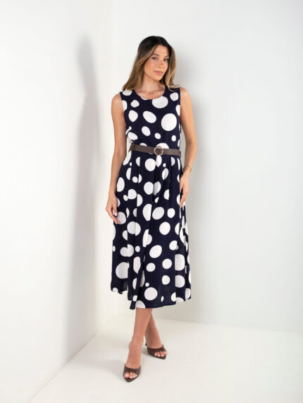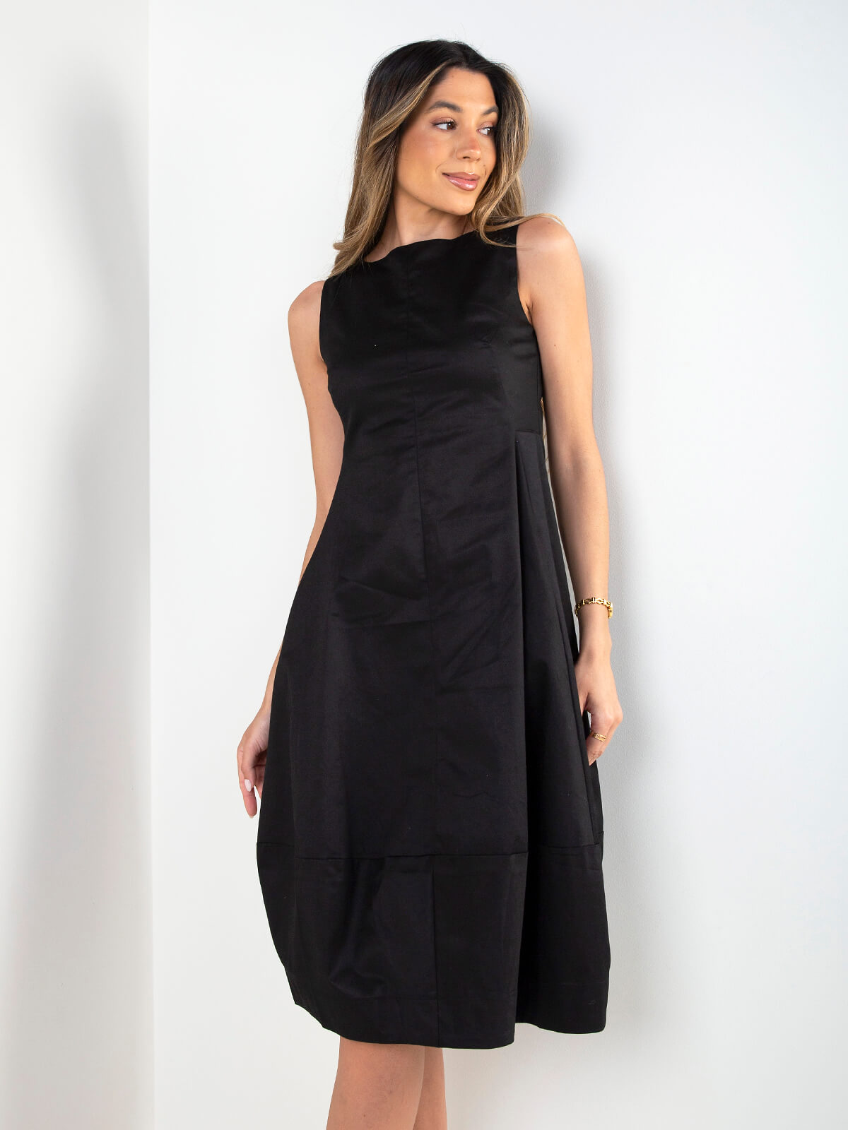 Vestido midi preto com corte fluido e sem mangas. Apresenta decote redondo e bolsos laterais, combinando conforto com um estilo minimalista. Ideal para looks versáteis do dia à noite.