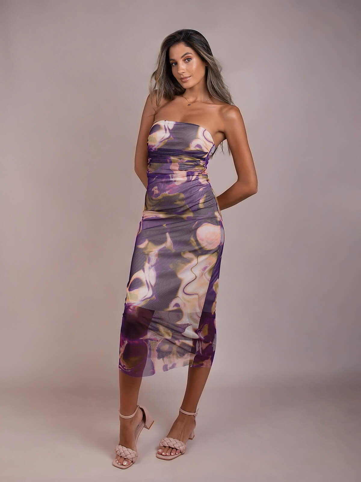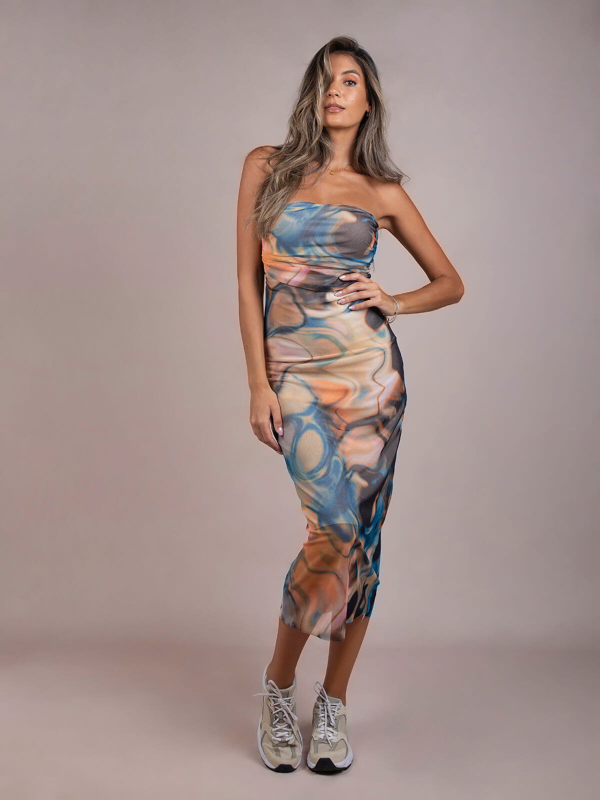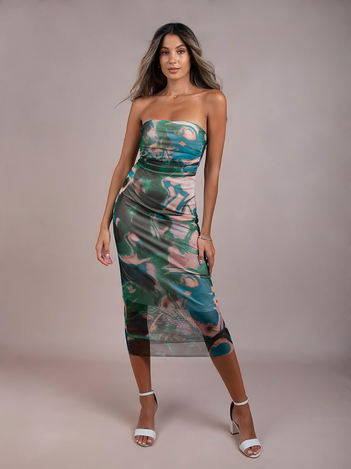 Vestido midi em tule com pormenor drapeado. Vestido justo estampado com decote caicai. Interior forrado.