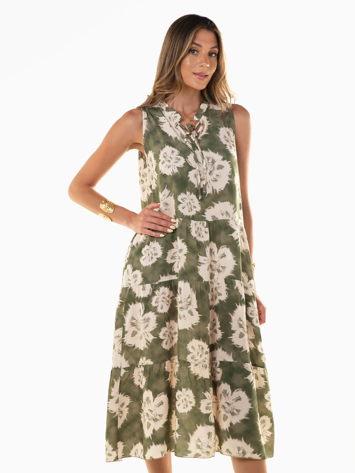 Vestido midi verde sem mangas com estampado floral abstrato para mulher. Vestido fluído com painéis e gola mao. Cordão no decote para ajustar.