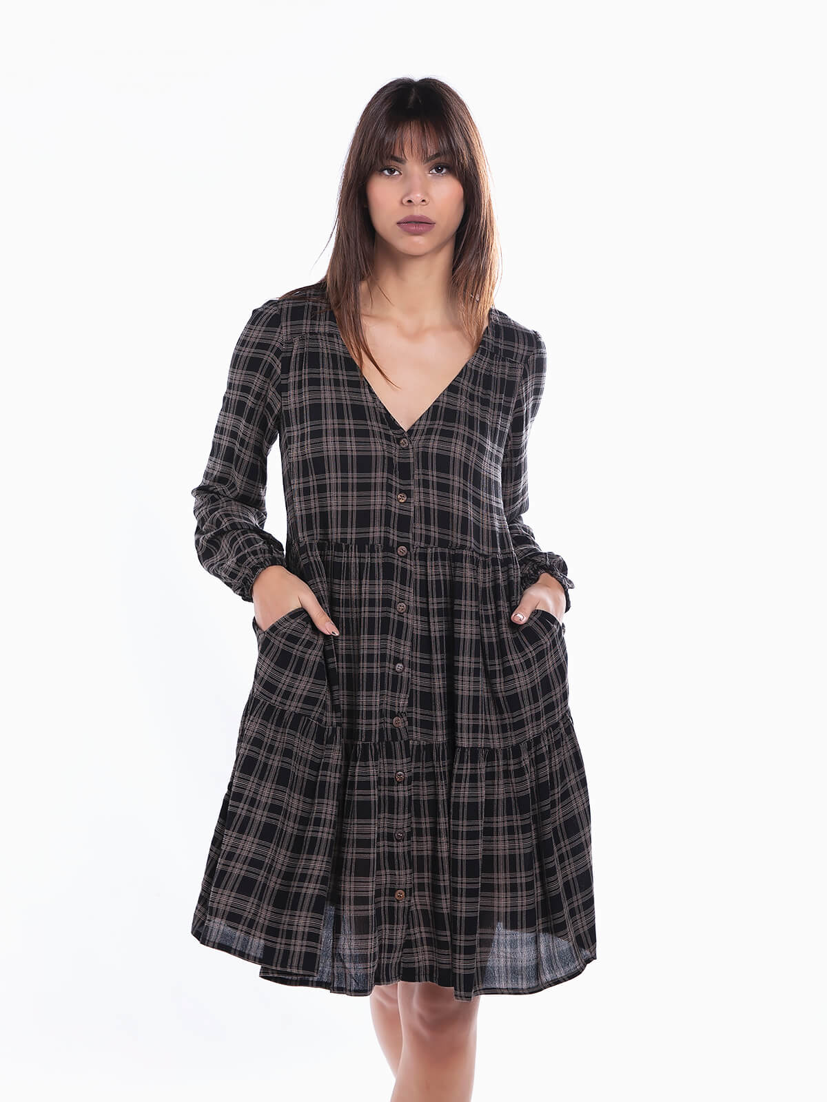 Vestido midi estampado xadrez com folhos. Vestido fluído de manga comprida com decote em V. Punhos elásticos. Aperto de botões na frente.