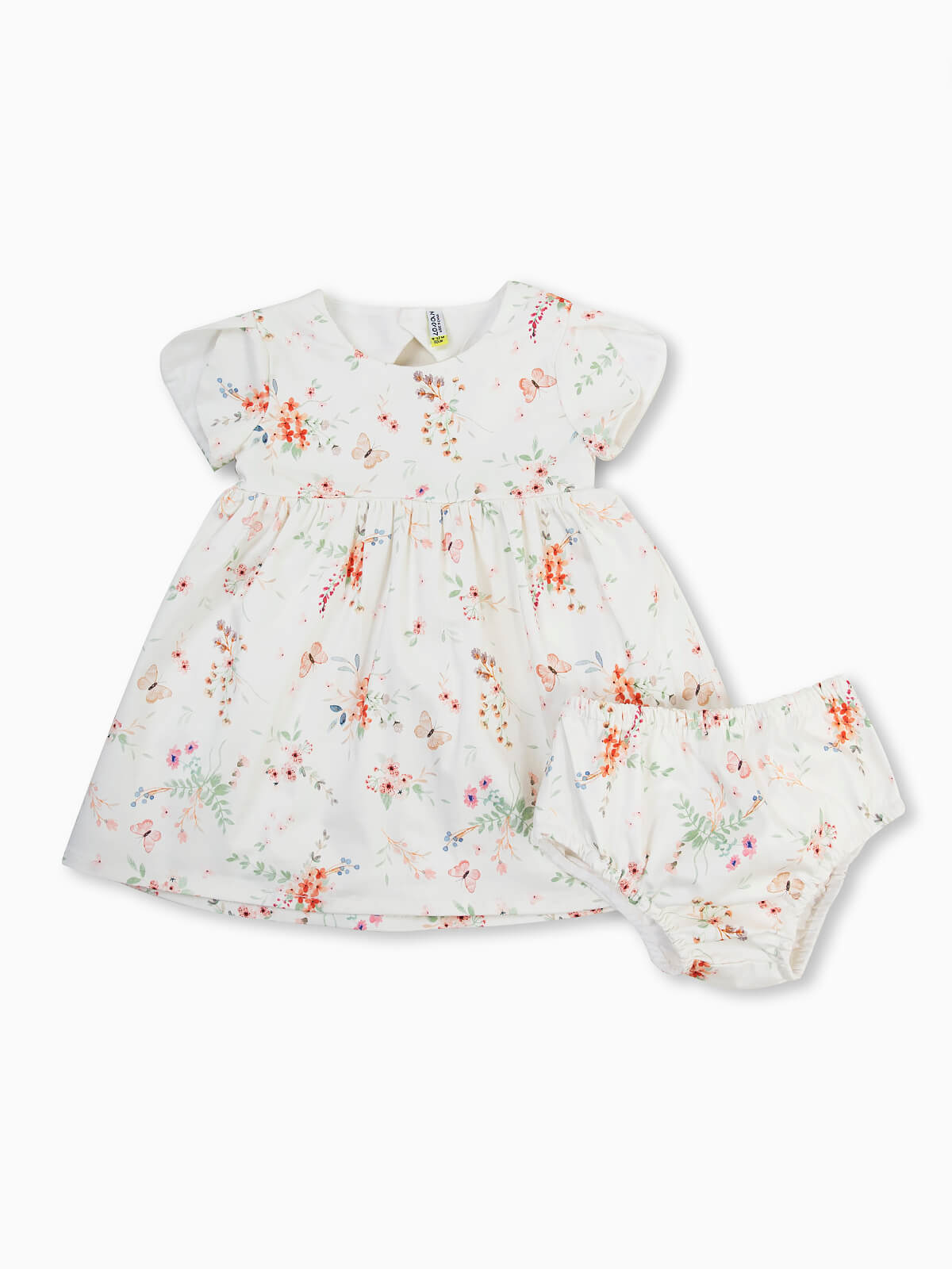 Vestido pérola floral de manga curta com interior forrado. Vestido para bebé menina com decote redondo e aperto posterior de botão. Cintura elástica. Cueca florida elástica.