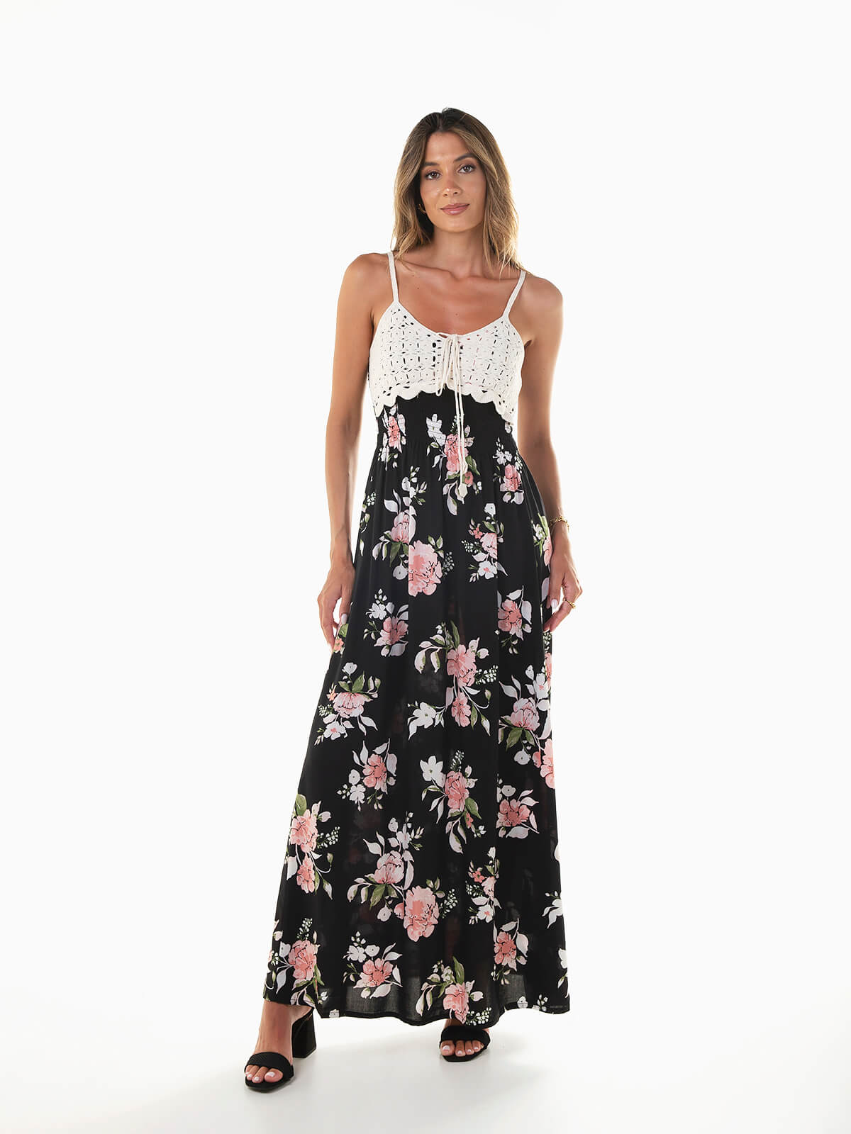 Vestido curto fluído preto com padrão floral em contraste. Vestido de alças com parte superior em crochet e franzido smock. Decote em bico e cordão para laço.