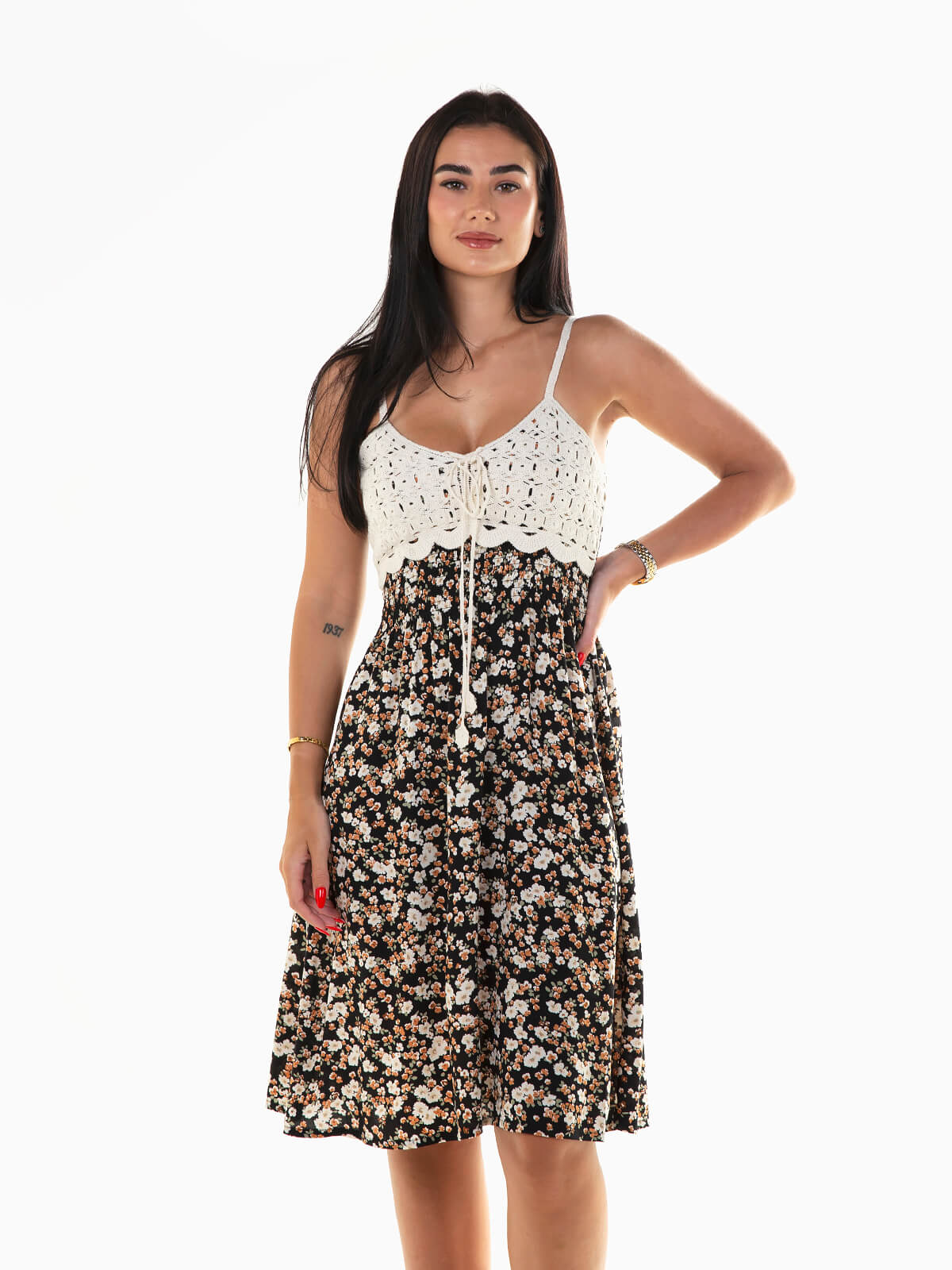 Vestido curto fluído preto com padrão de flores em contraste. Vestido de alças com parte superior em crochet e franzido smock. Decote em bico e cordão para laço.