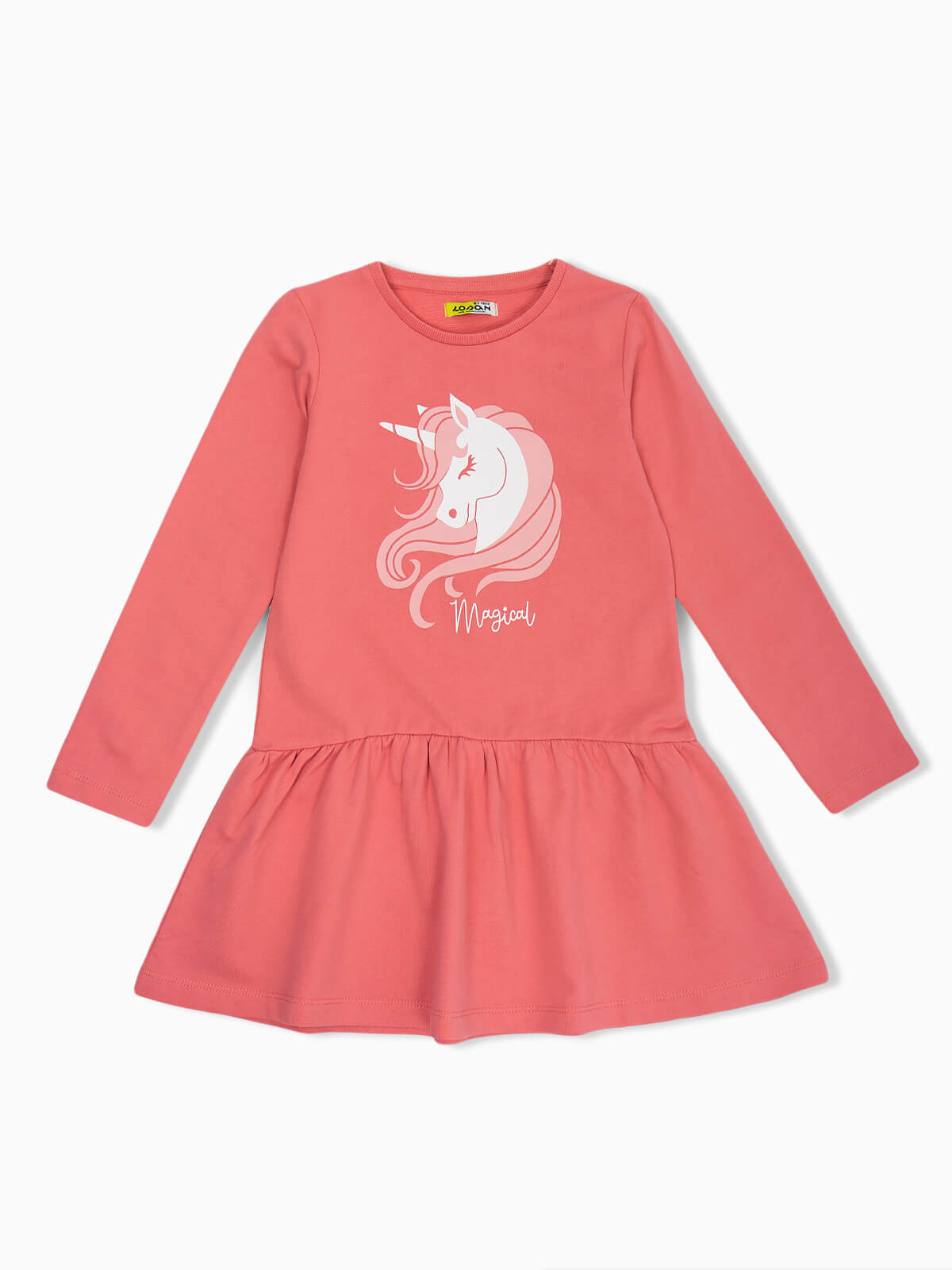 Vestido rosa com estampado unicórnio e encaixe de folho na base. Vestido manga comprida com decote redondo e acabamentos canelados.