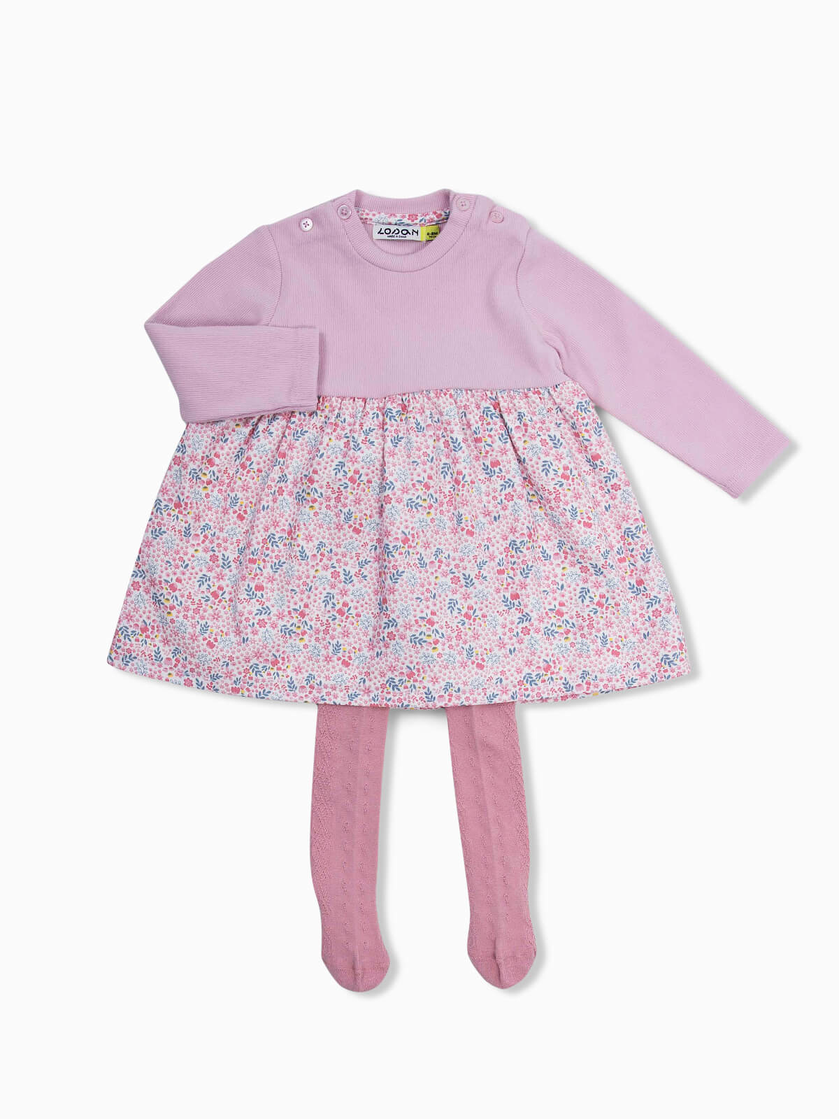 Vestido rosa de manga comprida para bebé menina com estampado floral. Vestido corte godé com decote redondo e aperto de botões. Interior forrado. Meia-calça elástica com relevo.