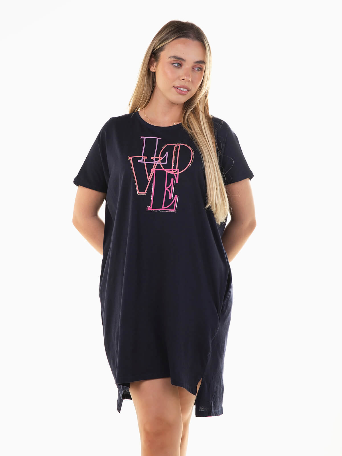 Vestido azul marinho estilo túnica com estampado e strass aplicado para efeito brilhante. Vestido largo de manga curta com 2 bolsos e decote redondo. Cós mais comprido atrás.