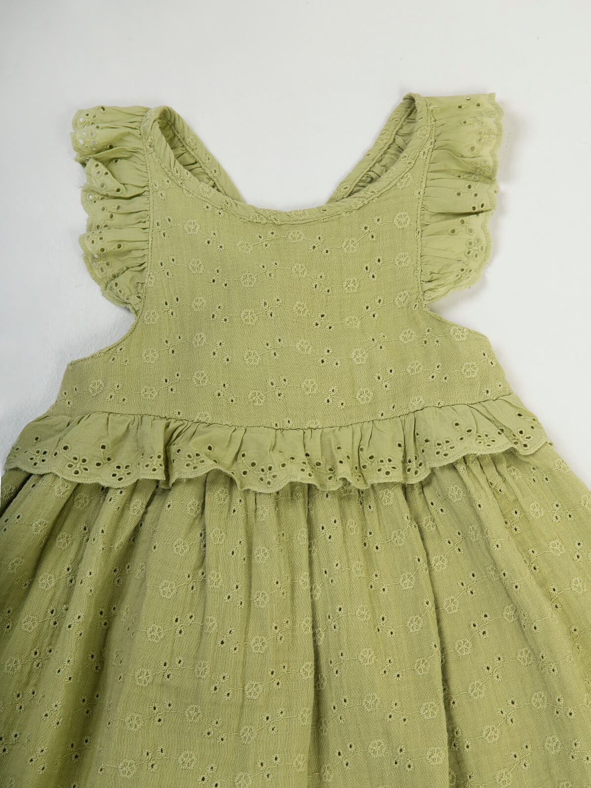 Vestido verde bordado inglês em tecido 100% algodão com aparência linho. Vestido com alças cruzadas atrás e encaixe de folhos. Interior forrado e cintura elástica.