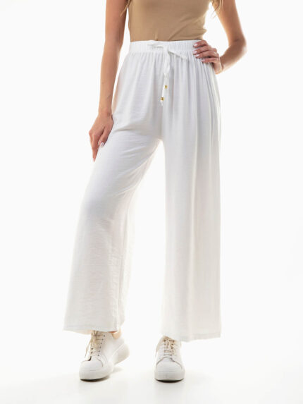 Calças wide leg com pregas e flor
