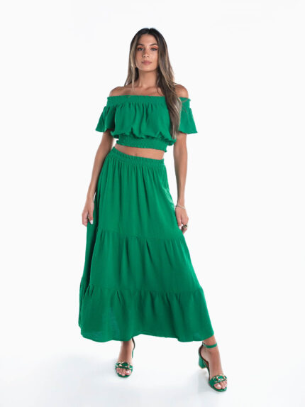 Conjunto fluído crop top e saia