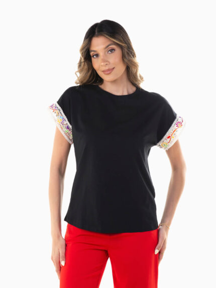 T-shirt manga curta motivos bordados