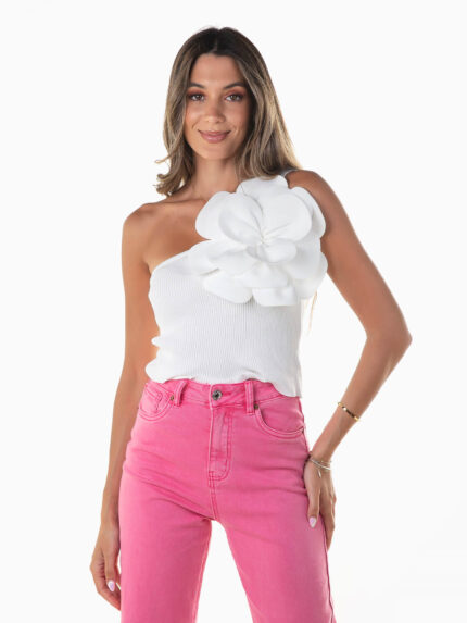 Top ombro assimétrico com flor
