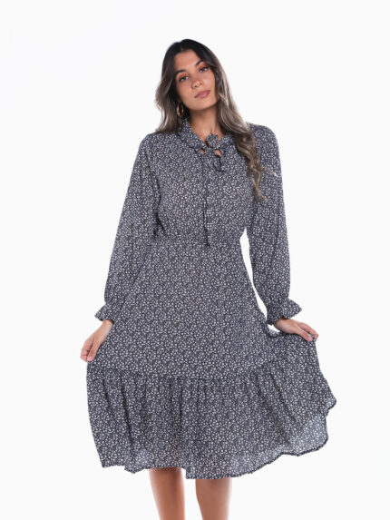 Vestido midi floral com folhos